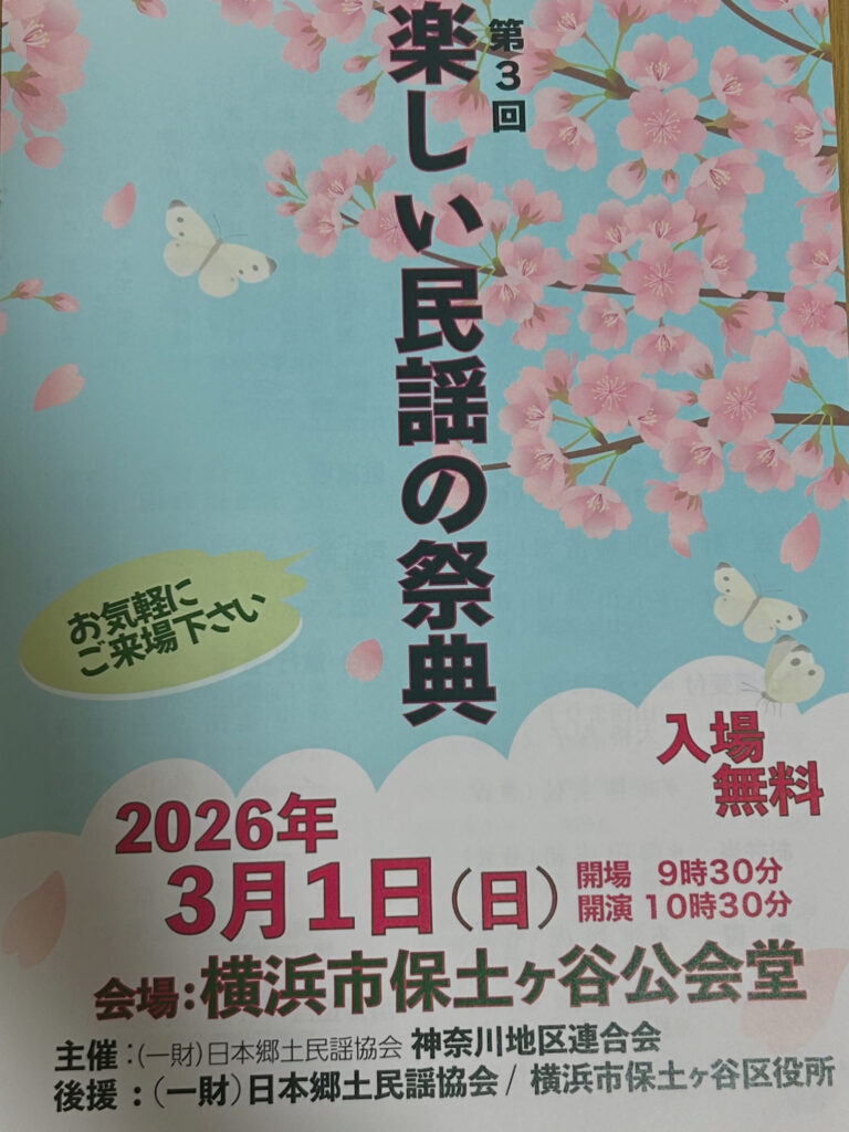 来月の2026年3月1日(日)に横浜市保土ヶ谷公会堂にて、楽しい民謡の祭典が開催されます。